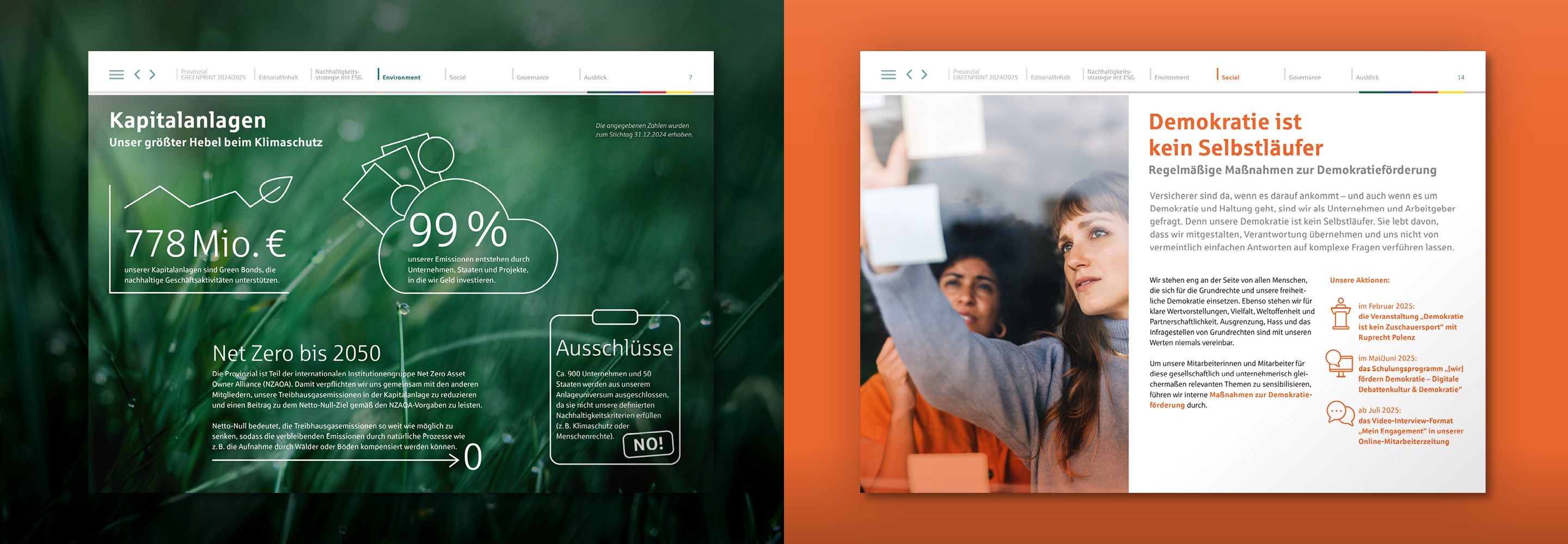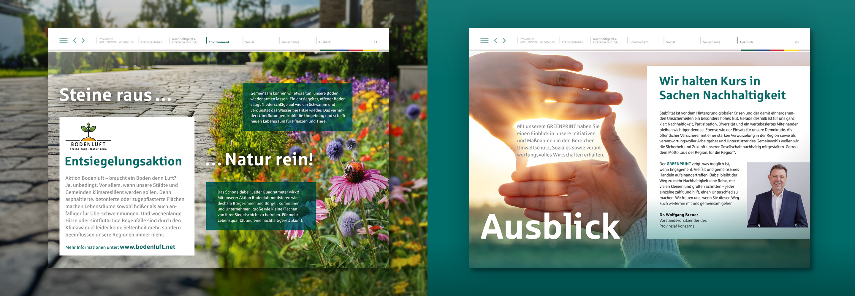 Ob Umweltschutz, soziale Verantwortung oder nachhaltiges Wirtschaften: Der GREENPRINT legt den Fokus ganz bewusst auf die drei zentralen Nachhaltigkeitsdimensionen Environment, Social und Governance (ESG) sowie auf ausgewählte Nachhaltigkeitshighlights des Provinzial-Konzerns. Zudem haben wir uns bei der Basiskonzeption und bei der Contenterstellung nah an der Nachhaltigkeitsstrategie der Provinzial orientiert. Im Ergebnis bietet der GREENPRINT einen kompakten und leicht verständlichen Überblick über die wichtigsten Aktivitäten des Konzerns in diesem Bereich – nach außen und nach innen, für die Kundinnen und Kunden ebenso wie für die Mitarbeiterinnen und Mitarbeiter.